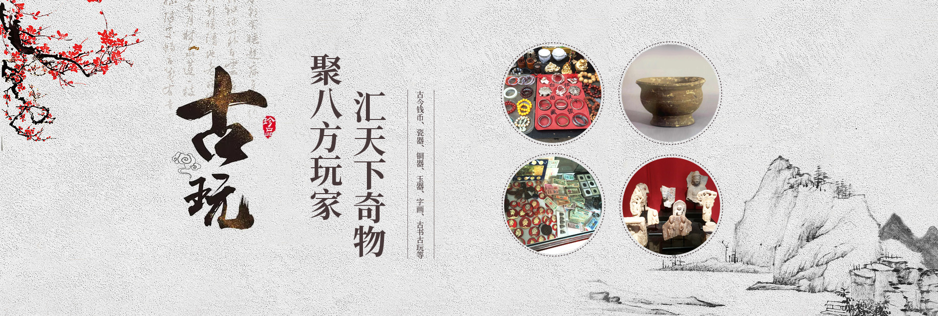 古今錢幣、瓷器、銅器、玉器、字畫、郵票、古書、文革品、古玩、雜項、民間舊物、工藝品等。